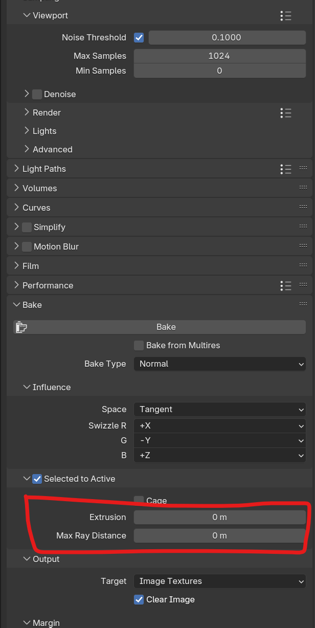 Now of course you are probably wondering at this point, how do I know what to set these numbers to? My rule of thumb is to set extrusion to the smallest value you can that makes the green pixels in the normal map go away. Then set the Max Ray Distance to ~1.5-2 times the Extrusion.