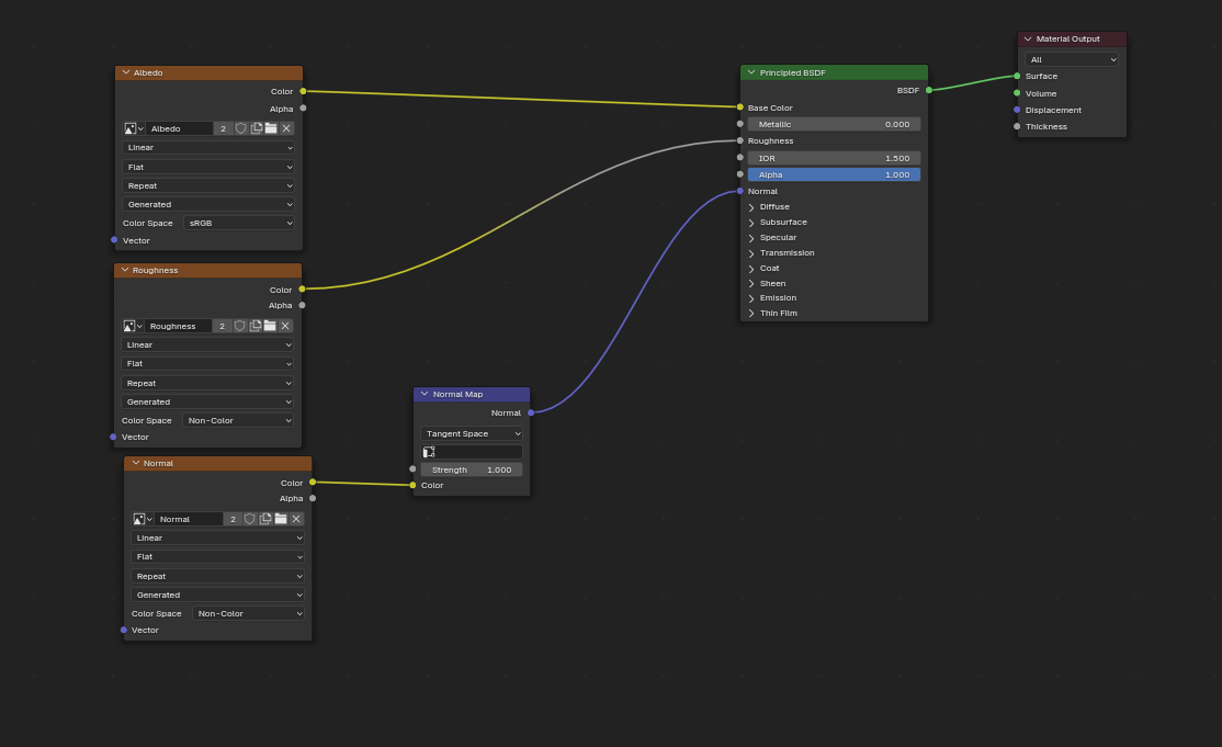 With the bake target selected we will add 3 texture nodes to it's material. Because I'm using a PBR workflow, these will be Albedo, Normal & Roughness (I will get into metalness later in this tutorial). These texture nodes should have their colour space set to "sRGB" for the Albedo and "Non-Color" for the others. You should NOT connect these nodes to anything.